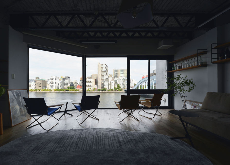 The fourth floor of VINOMONDO is a café & wine lounge. Floor-to-ceiling windows offer a full view of the Sumida River. During the day, enjoy the open riverside atmosphere; at night, take in the illuminated Eitai Bridge and city lights.